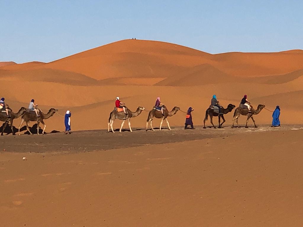 Après avoir le temps pour le magnifique lever de soleil, Déjeuner,puis départ pour une excursion en 4x4 autour des dunes de l'Erg Chebbi,certains culminent jusqu'à 150 m de hauteur,puis continuez vers le village de KHAMLIA, une opportunite de vivre une belle expérience d’une exposition de musique Gnaoua, apres le village de Merzouga et l'oasis de Hassilabied avec son système d'irrigation. Retour pour le Dîner à l’auberge et temps libre pour profiter de la beauté du désert dans votre hébergement situé directement au pied des dunes de sable, accès pour piscine , escalade des dunes un moment de détendre dans ce cadre paradisiaque.Après-midi,le bon moment de retrouver les chameliers pour une balade à dos de dromadaire à travers les dunes pour admirer un magnifique coucher de soleil,une pause sur les dunes et un retour sur les dos de dromadaires à votre Hébergement pour le Souper.